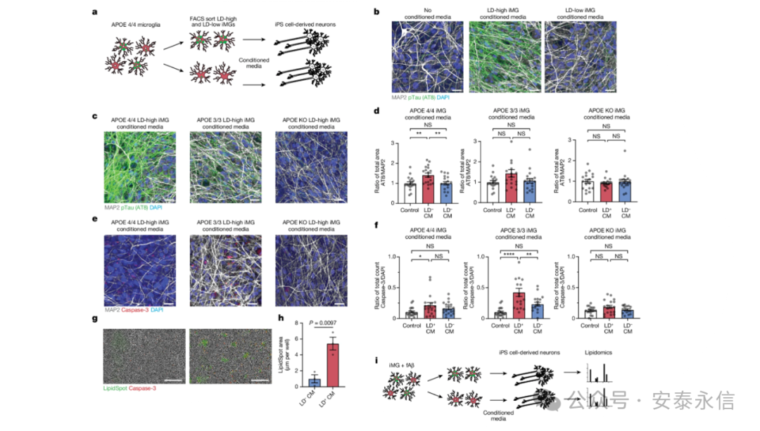 LD诱导神经元细胞Tau磷酸化 研究人员通过Sony MA900多功能全自动分选仪将APOE4/4 iPS细胞来源的小胶质细胞分选LD-high和LD-low两细胞群,分别在神经基础培养基中培养12 h,形成条件培养基,用其培养APOE4/4 iPS细胞来源的人类神经元。实验结果显示只有LD-high iPS细胞来源的小胶质细胞条件培养基可诱导iPS细胞来源的神经元中的高浓度Tau磷酸化(pTau),而LD-low iPS细胞来源的小胶质细胞条件培养基诱导的pTau浓度与对照组相似。