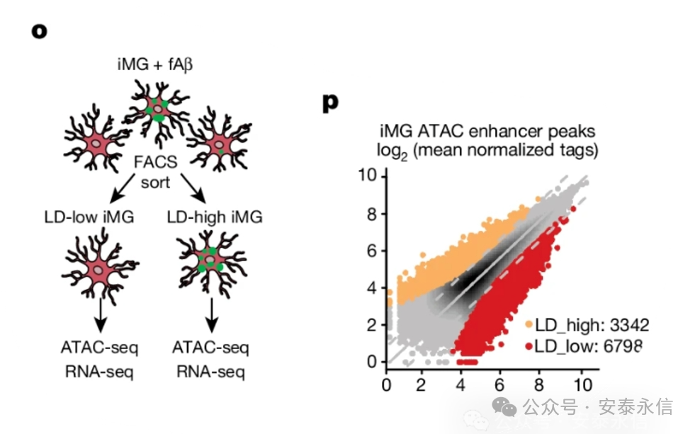 LD积累的小胶质细胞的转录组评估 研究人员使用Sony MA900多功能全自动分选仪分选LD-high和LD-low iPS细胞来源的小胶质细胞,随后进行了ATAC-seq和RNA-seq。结果显示LD-high小胶质细胞特异性富集NF-κB家族转录因子相关的基序,与LD-low小胶质细胞相比,前者具有更高的NF-κB相关的促炎细胞因子的表达,以及更低的小胶质稳态标志物的表达。