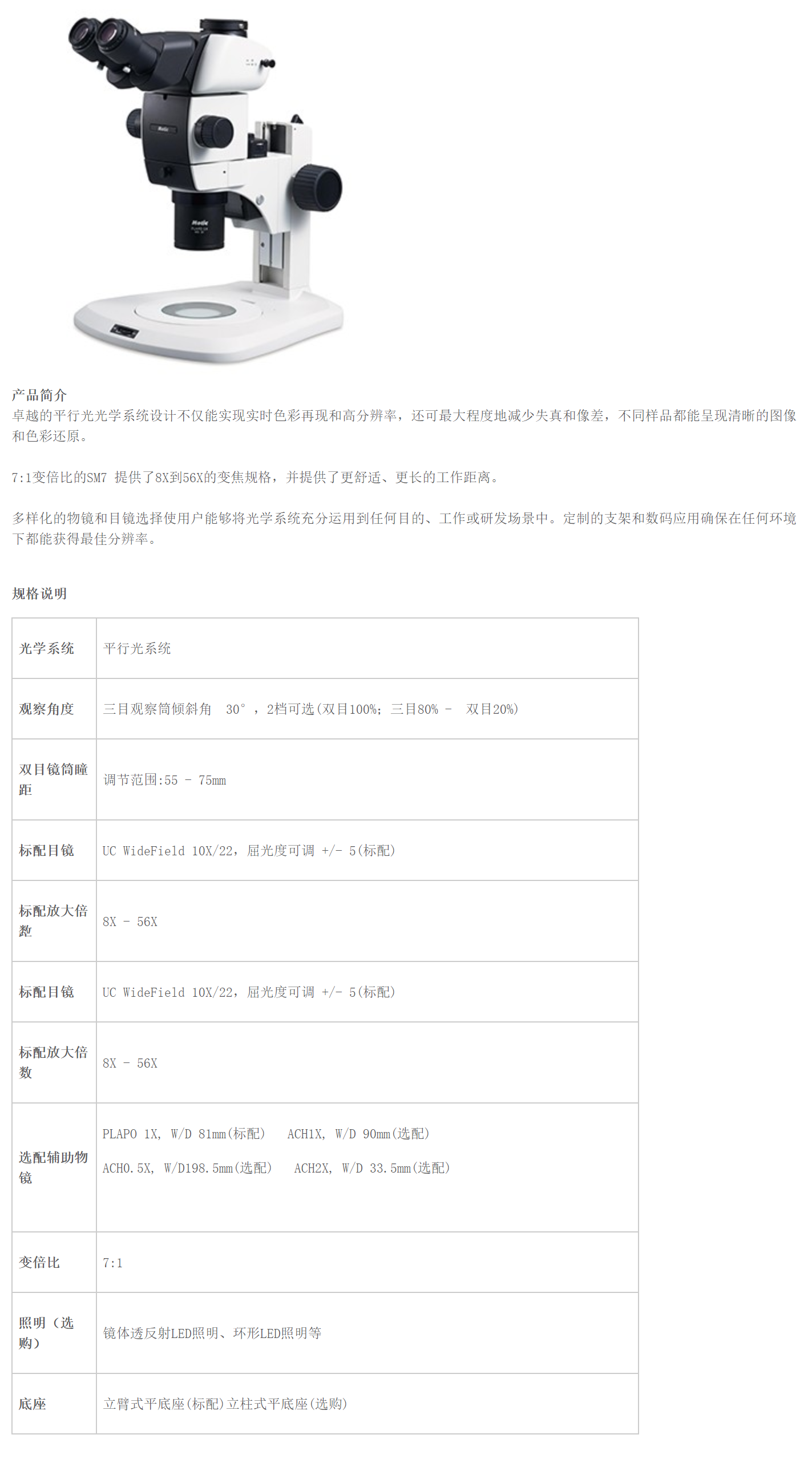卓越的平行光光学系统设计不仅能实现实时色彩再现和高分辨率,还可最大程度地减少失 真和像差,不同样品都能呈现清晰的图像和色彩还原。 7:1 变倍比的SM7 提供了8X 到56X 的变焦规格,并提供了更舒适、更长的工作距离。